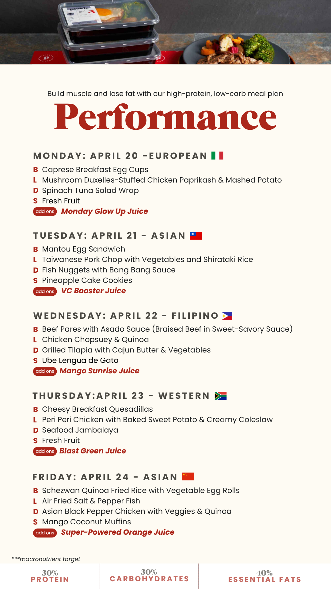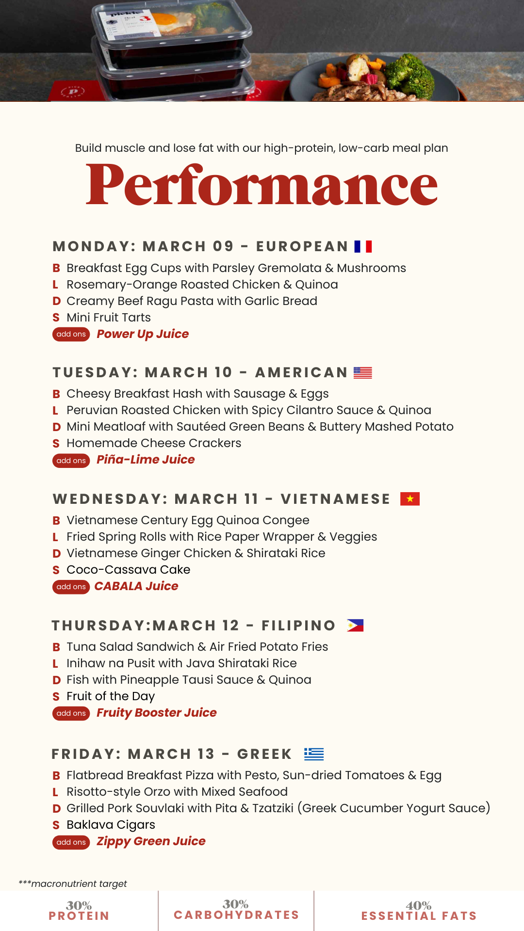 Our Performance Meal Plan is recommended for those who are looking for a low-carbohydrate, high-protein diet. Our Performance Meal Plan replaces starchy carbohydrate sources such as rice, bread, and pasta with low glycemic sources such as veggies, sweet potatoes, beans, and legumes.